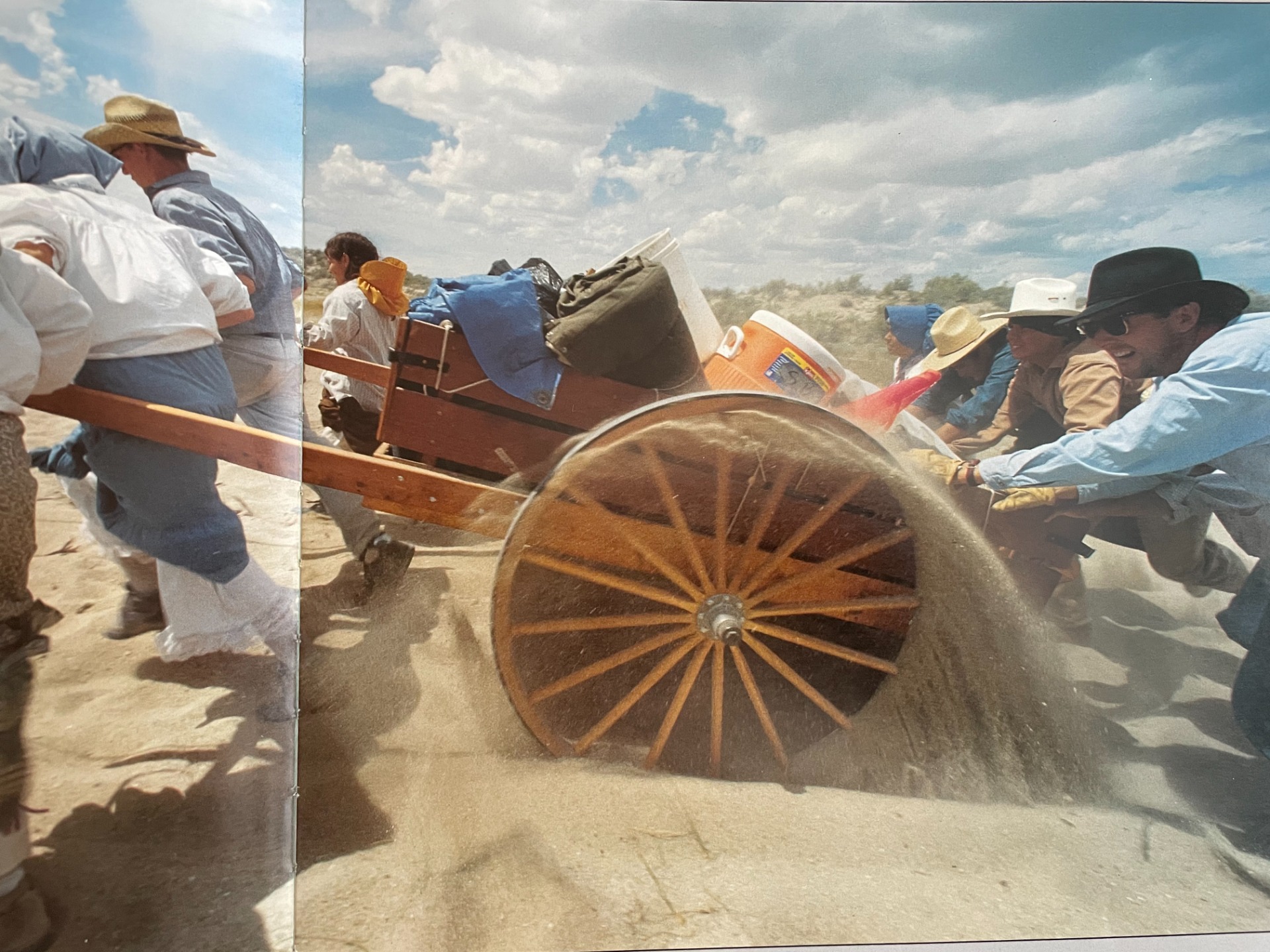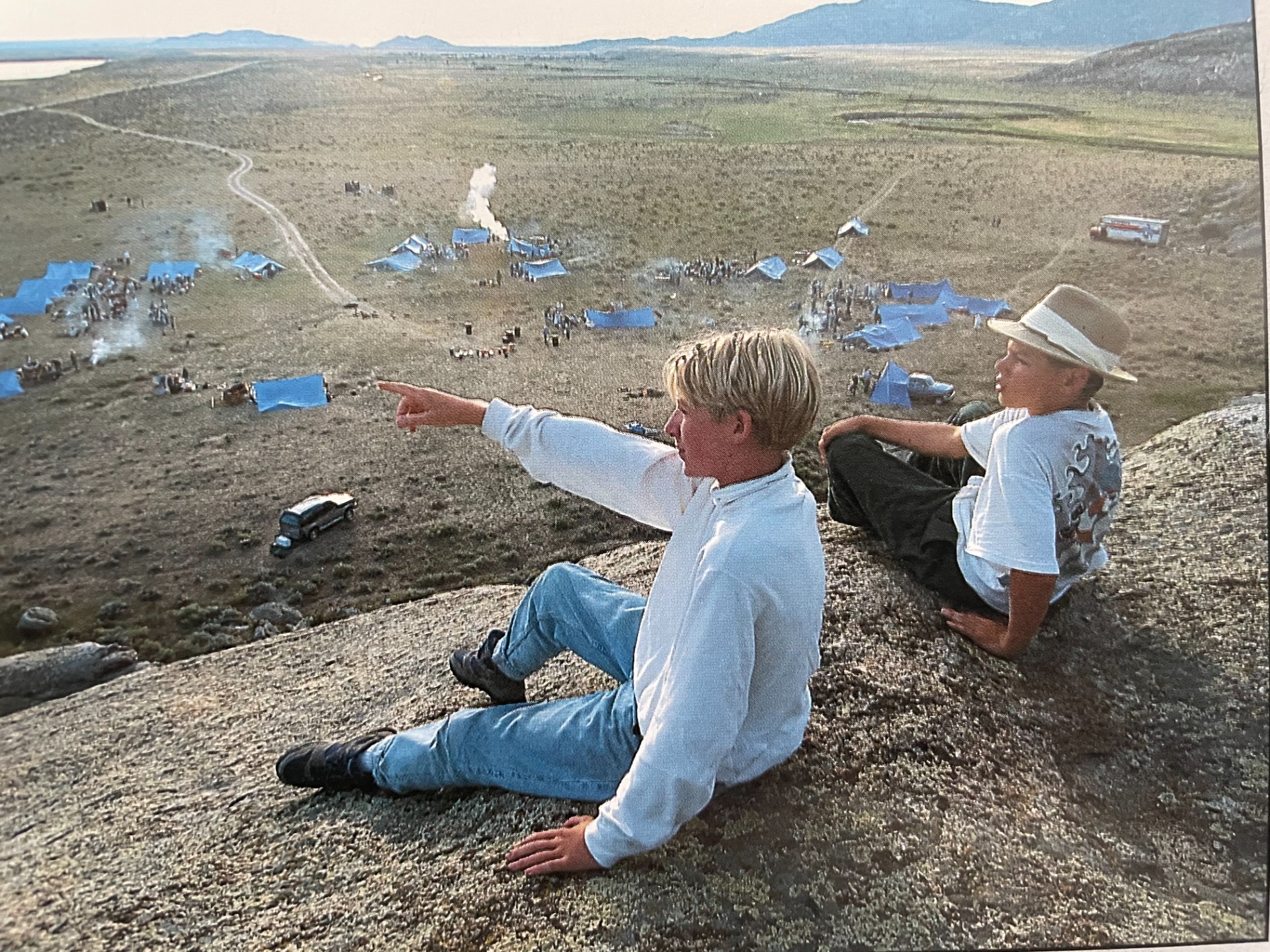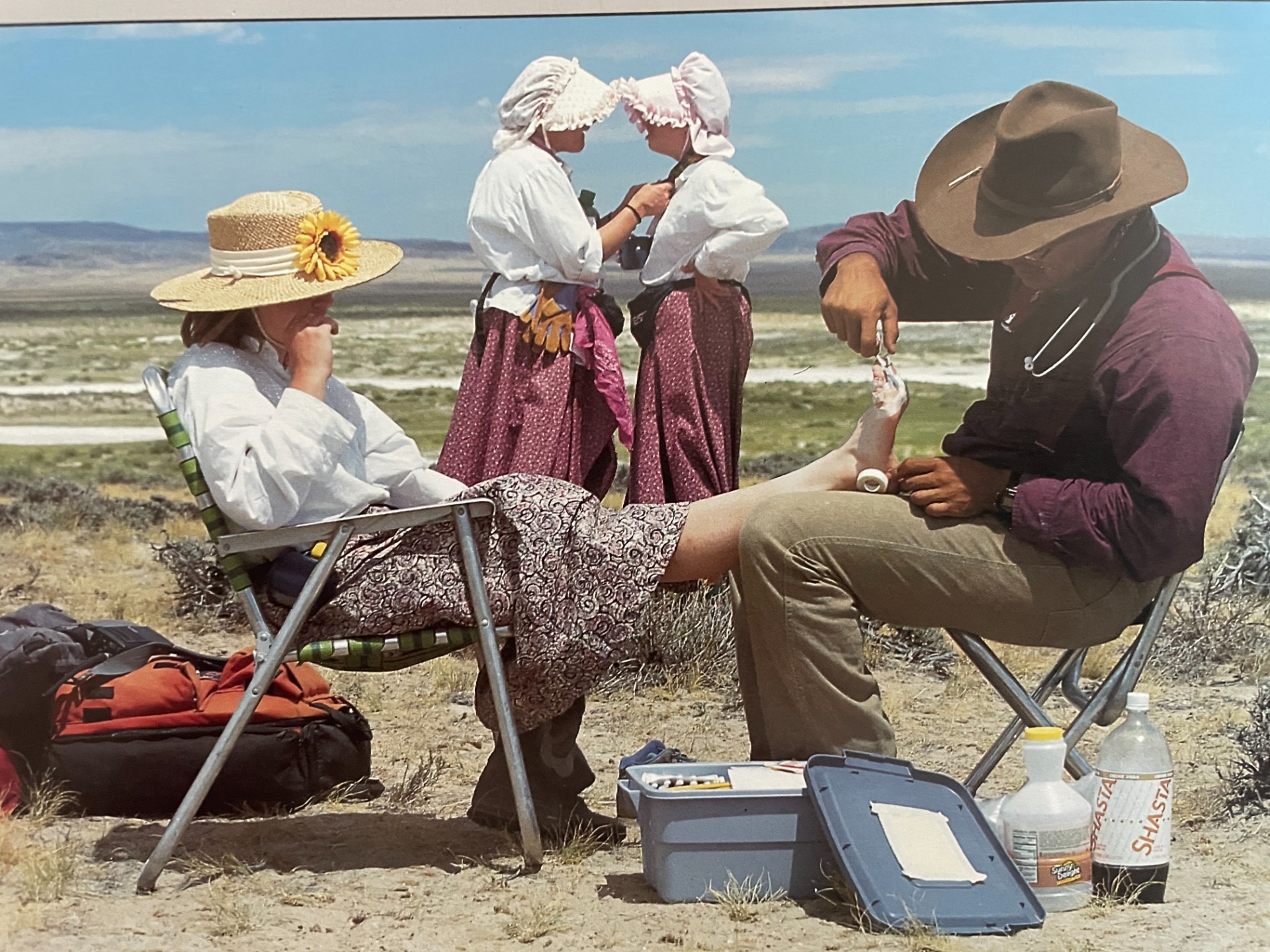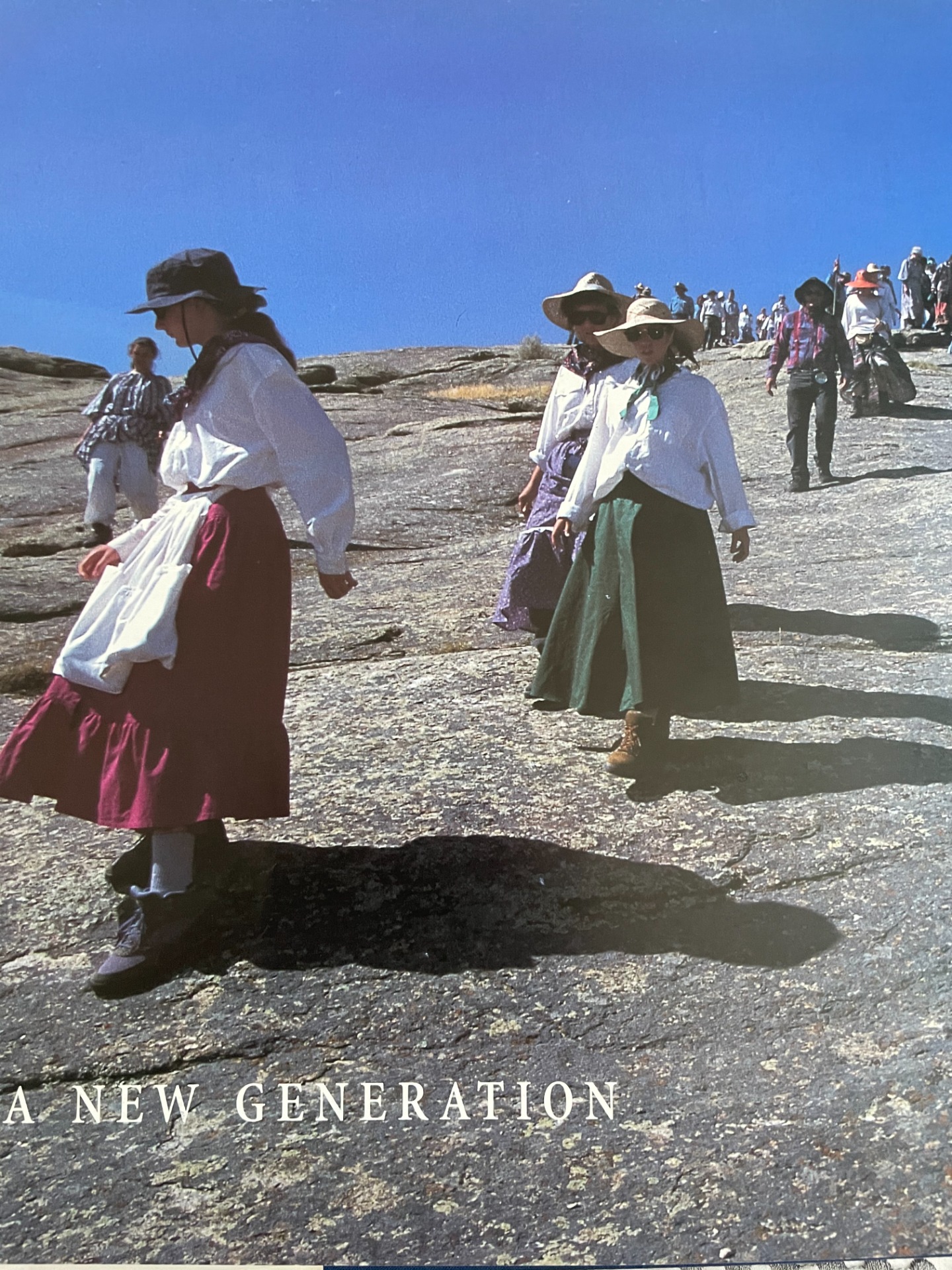 Sister Bousfield (pictured in the green skirt walking down Independence Rock) attended trek "before there was a place to rent handcarts, before there was a handbook to help plan a trek, and before a movie about the trek experience existed." This was in the summer of 1994.