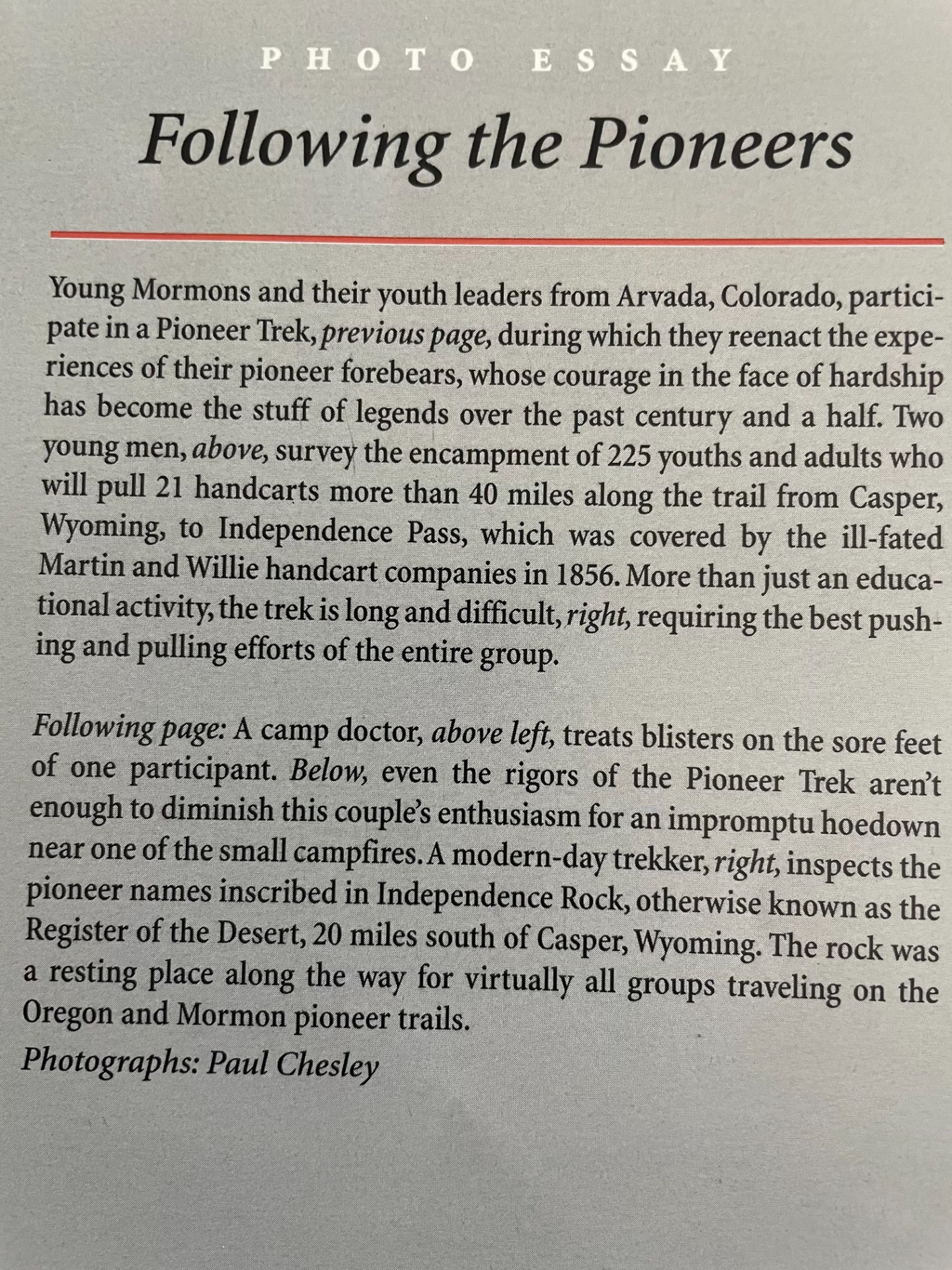The Colorado Arvada Stake had a strong desire to trek along the original Mormon-Oregon trail from Fort Casper, Wyoming to Martin's Cove, Wyoming - a distance of about 50 miles. At the time, Martin's Cove was on private property and was not owned by the church. Through faith and persistence, their group received permission to end their trek on the private property. Through their examples, the church was eventually able to purchase the property.